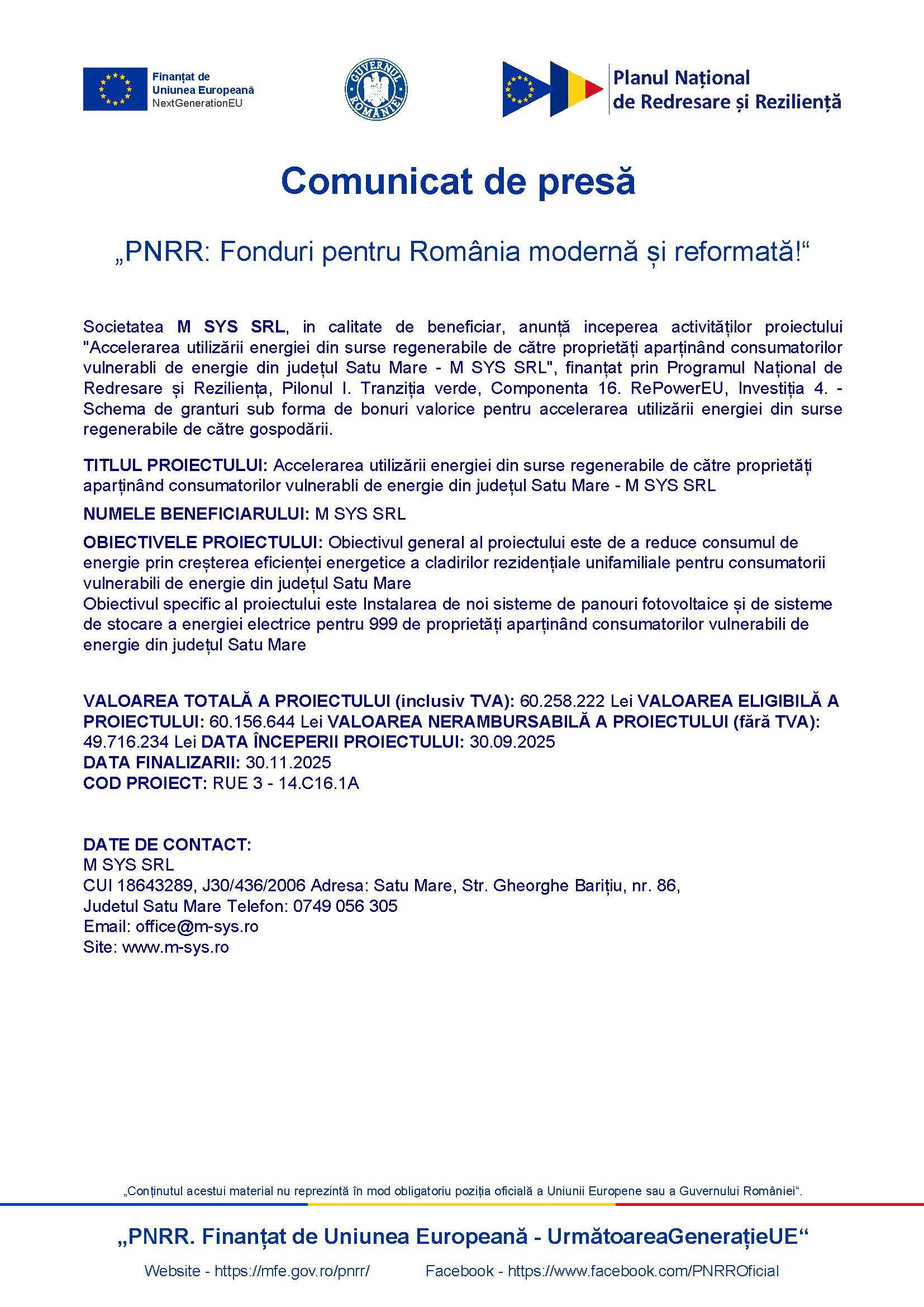 Societatea M SYS SRL, in calitate de beneficiar, anunță inceperea activităților proiectului "Accelerarea utilizării energiei din surse regenerabile de către proprietăți aparținând consumatorilor vulnerabli de energie din județul Satu Mare - M SYS SRL", finanțat prin Programul Național de Redresare și Reziliența, Pilonul I. Tranziția verde, Componenta 16. RePowerEU, Investiția 4. - Schema de granturi sub forma de bonuri valorice pentru accelerarea utilizării energiei din surse regenerabile de către gospodării.