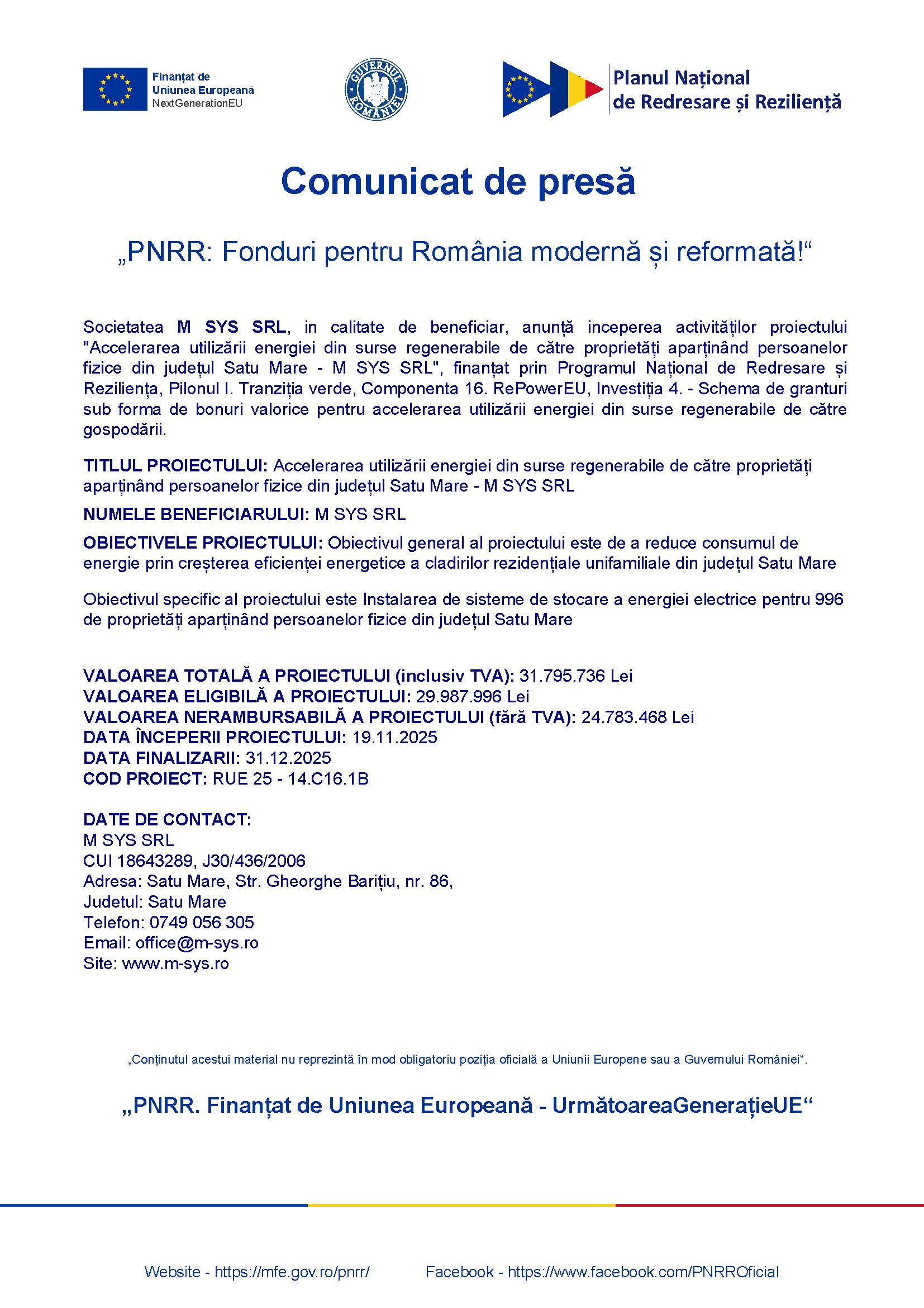 Societatea M SYS SRL, in calitate de beneficiar, anunță inceperea activităților proiectului "Accelerarea utilizării energiei din surse regenerabile de către proprietăți aparținând persoanelor fizice din județul Satu Mare - M SYS SRL", finanțat prin Programul Național de Redresare și Reziliența, Pilonul I. Tranziția verde, Componenta 16. RePowerEU, Investiția 4. - Schema de granturi sub forma de bonuri valorice pentru accelerarea utilizării energiei din surse regenerabile de către gospodării.